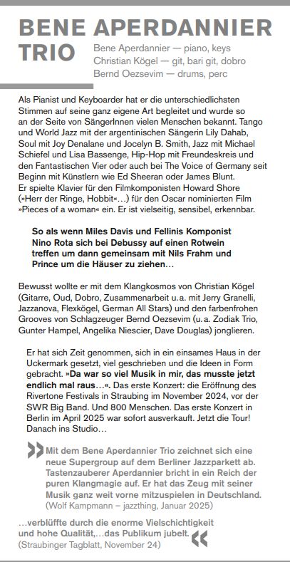 „Mit dem Bene Aperdannier Trio zeichnet sich eine neue Supergroup auf dem Berliner Jazzparkett ab. Tastenzauberer Aperdannier bricht in ein Reich der puren Klangmagie auf. Er hat das Zeug mit seiner Musik ganz weit vorne mitzuspielen in Deutschland.“