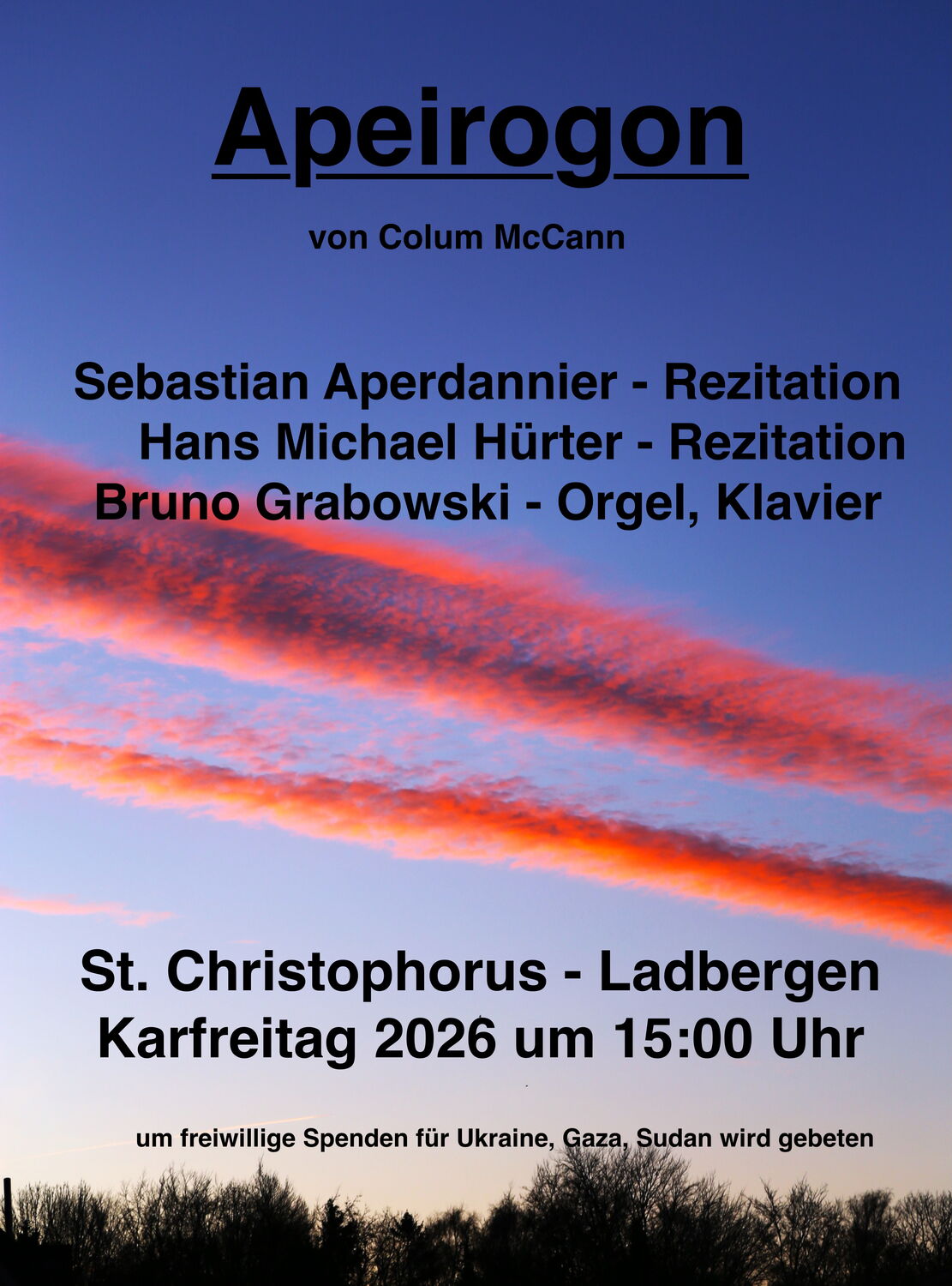 Seit einigen Jahren bereichert Sebastian Aperdannier aus Münster den Karfreitag in der Christophorus-Kirche mit seinen eindrücklichen Lesungen. Für die diesjährige Lesung hat er einen Text aus dem im Jahr 2022 erschienenen Roman „Apeirogon“ von Colum McCann ausgewählt.